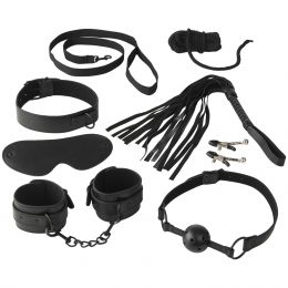 CONTENU : Martiner, menottes avec chaîne, collier, bâillon, bandeau, laisse, corde, pinces à tétons à clochettes.