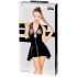 La robe est en laque noire du buste vers le bas où une fermeture éclair argentée délimite la surface brillante. Le vêtement se termine par une mini jupe féminine un peu plus longue dans le dos.