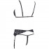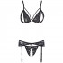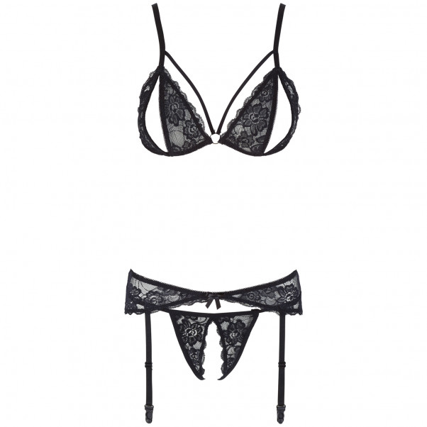 CE QUE L’ENSEMBLE CONTIENT : Un soutien-gorge ouvert, un porte-jarretelles et un string ouvert.
