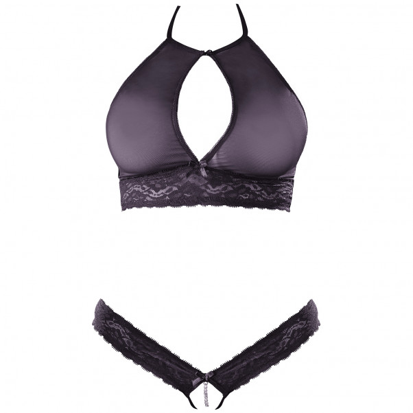 Le haut est doté d’un dos nu et d’une ouverture en forme de trou de serrure qui attire les regards sur le trésor. En partie grâce à la dissimulation partielle, mais aussi grâce à la maille transparente. Il est fermé sur le devant au moyen d’un petit bouton. La bande de dentelle élastique sous la poitrine offre un ajustement magnifiquement moulant.