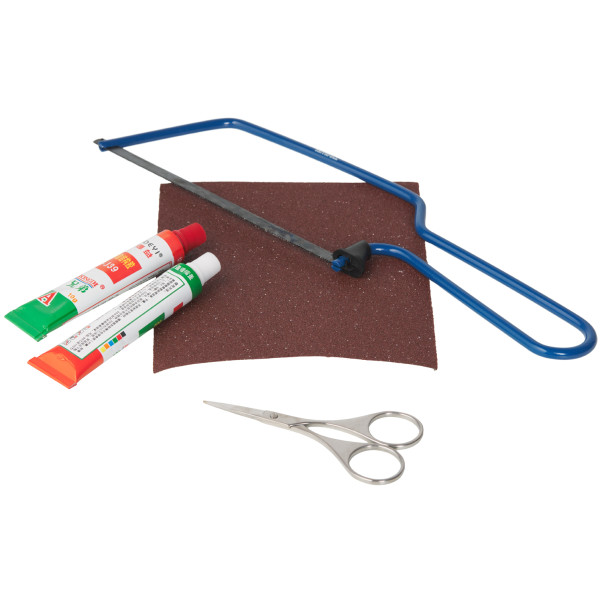 COMPREND : Trois gaines de tailles différentes, un cylindre avec accessoires, une scie, des ciseaux, du papier de verre et de la colle.