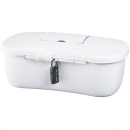 Elle se ferme avec un verrou coulissant et un cadenas à code pour plus de sécurité. La boîte comporte des trous d’aération pour permettre l’évaporation de l’humidité, et elle est même antimicrobienne, pour empêcher la propagation des germes.