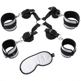 L'ensemble se compose de 4 menottes souples qui se fixent autour des mains et des pieds avec du velcro. Ces menottes, à l'aide de petits crochets métalliques, se fixent à chacune des sangles, qui se fixent aux sangles croisées qui passent sous le lit.