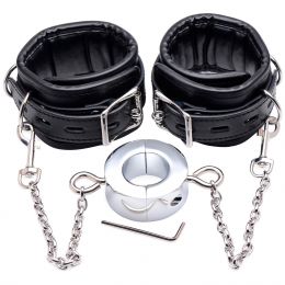 L’étireur de testicules se compose de métal sans nickel et pèse un poids impressionnant de 388 g. Il est vissé grâce à la clé Allen incluse, votre partenaire ne peut donc pas se libérer sans votre accord. Les deux chaînes sont fermement attachées à l’étireur de testicules, mais elles se connectent aux poignets via des fermoirs mousquetons pivotants pour un retrait facile.