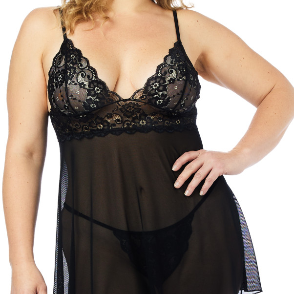 Prélassez-vous dans la chaleur que vous ne manquerez pas de créer en portant cet ensemble confortable et sexy. Des bretelles fines et réglables descendent le long de vos épaules pour rejoindre la dentelle transparente qui recouvre vos seins. La jupe est ample et ouverte dans le dos, exposant vos fesses et son string fin.
