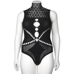 La dentelle transparente à motifs couvre le haut de votre poitrine, tandis que le décolleté permet d'apercevoir le reste de votre poitrine. Des cercles créent une croix à travers votre ventre pour donner une forme de sablier. Le bouton pression sur votre entrejambe permet d'avoir un accès facile pour vos pauses dans la salle de bain et pour les moments où la température chauffe.