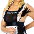 La coupe ample du costume fait peu pour couvrir la splendeur de votre corps. Les ornements en dentelle blanche contrastent avec le noir, tandis qu'une ceinture en satin accentue votre taille. Le carré blanc sur le ventre sert à récupérer les éclaboussures, si jamais les choses se gâtent.