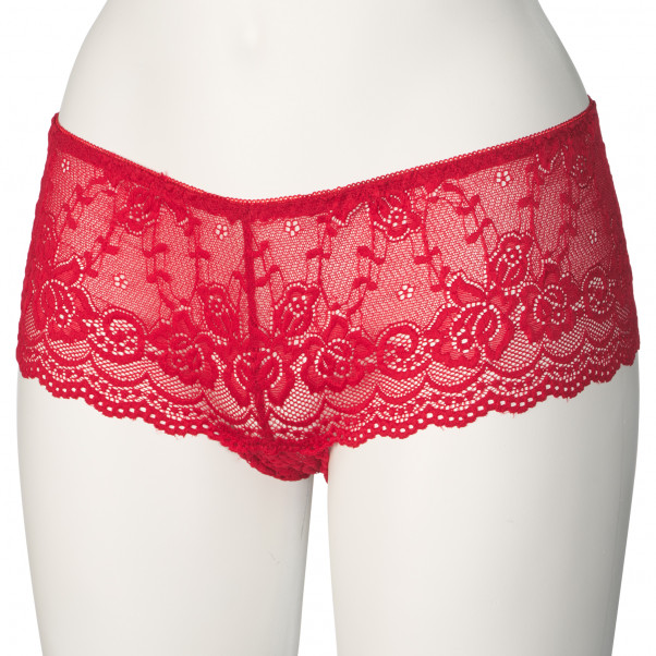 Glissez-vous dans les sous-vêtements parfaits pour les soirs de rendez-vous de NORTIE. Ce shorty Gunilla rouge est en dentelle rouge transparente avec une coupe qui met en valeur le fessier.