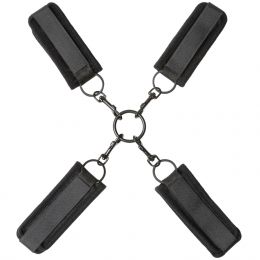 L'ensemble se compose de deux menottes de poignets, de deux menottes de cheville et d'un anneau de fixation auquel attacher les menottes à l’aide des mousquetons inclus.