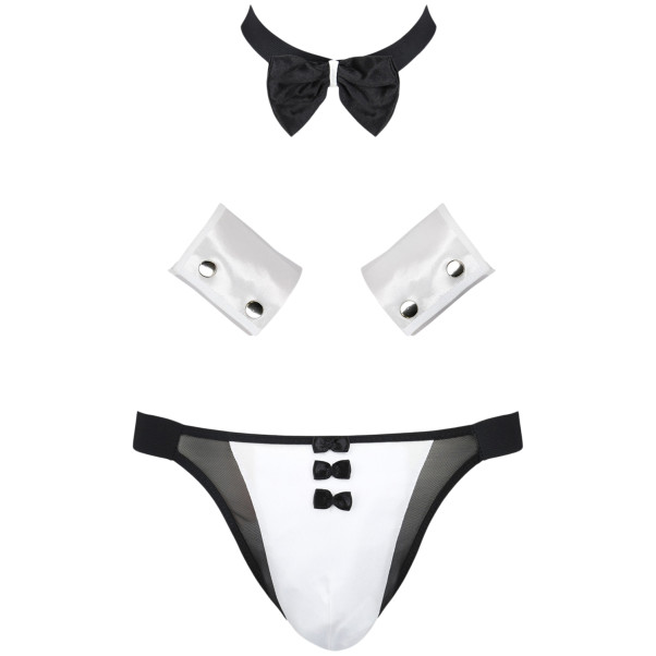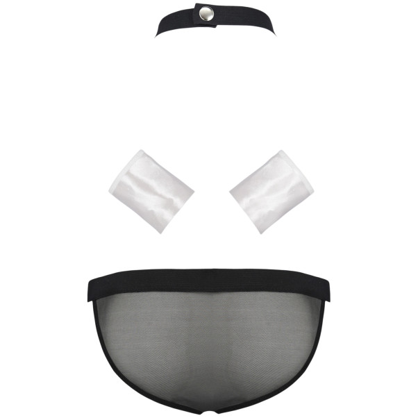 Répondez aux besoins de votre partenaire en portant le col noir, les manchettes blanches et le slip triangle. Faites bien votre travail, et votre partenaire aura peut-être envie de suivre la rangée de nœuds pour vous remercier de vos services.