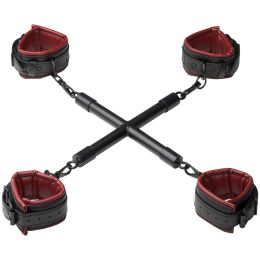 Utilisez les menottes rembourrés en similicuir pour attacher les poignets et chevilles de votre partenaire et faites preuve de créativité en décidant de la position à adopter. La barre d'attache est en forme de X avec des joints toriques à chaque extrémité pour se connecter facilement aux menottes - ou à d'autres accessoires de contrainte de votre collection.